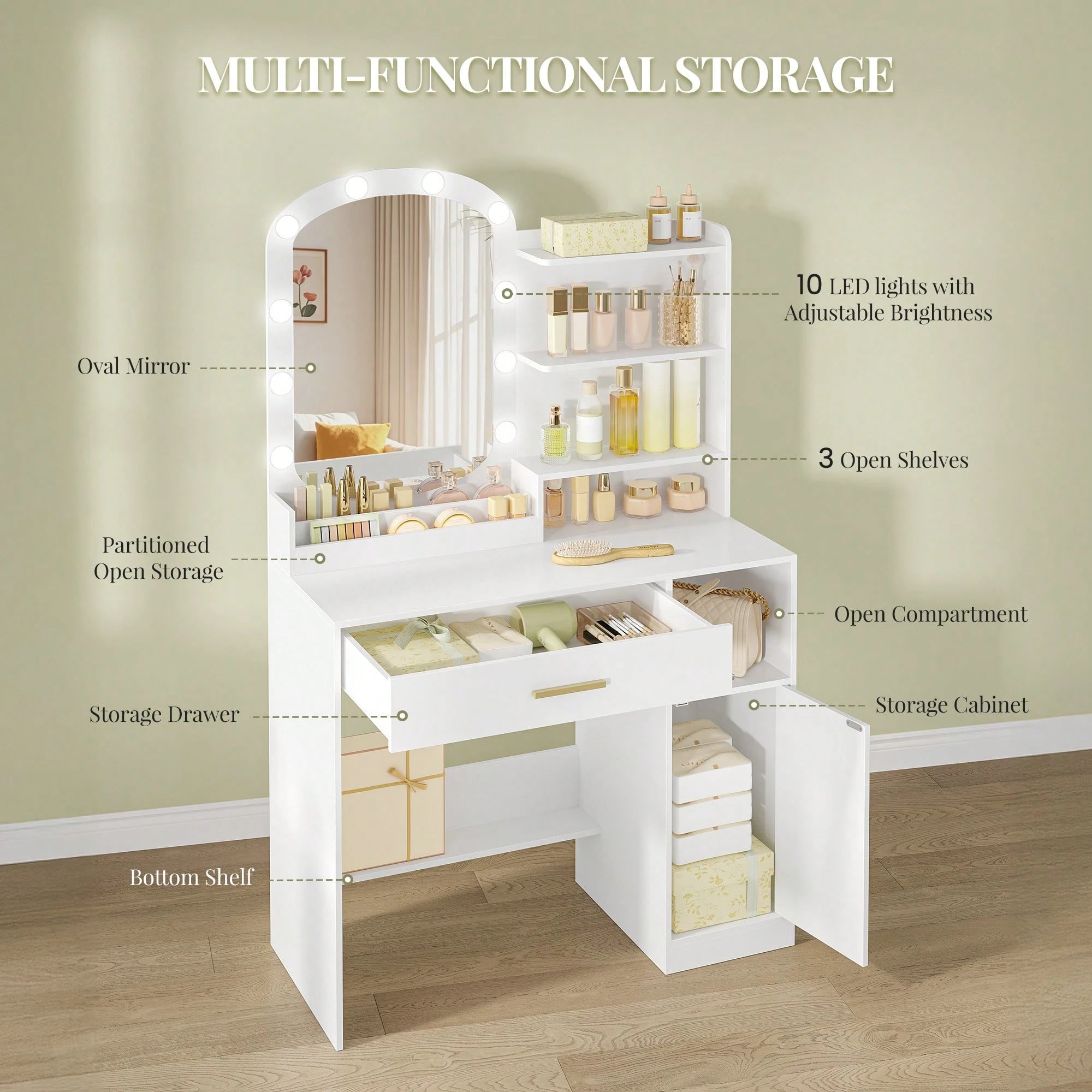 Toletta con specchio ovale, toletta, toletta con cassetti, mobiletto portaoggetti e vani a giorno bianco