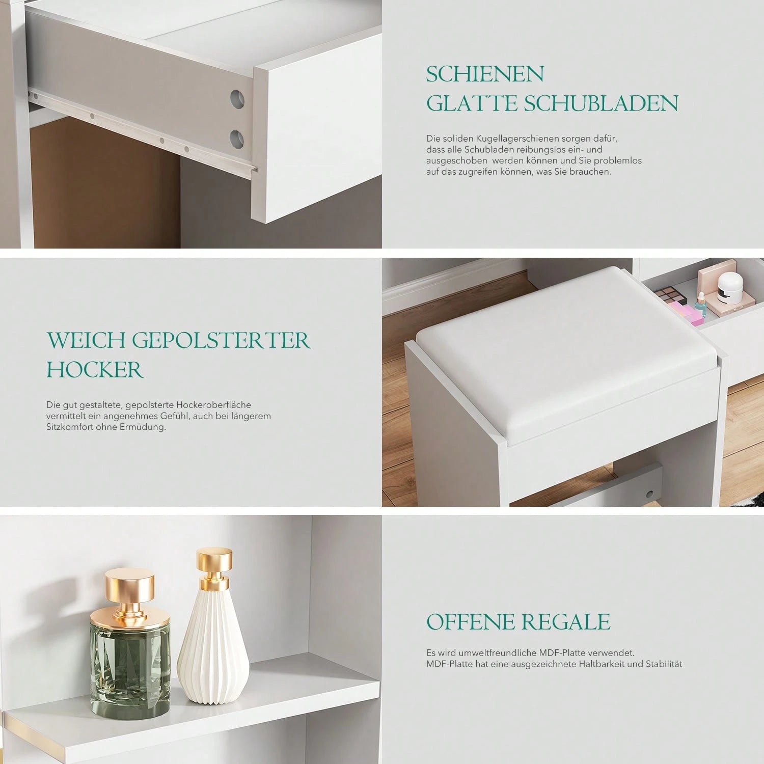 Ogni pezzo combina funzionalità e stile, offrendo ampi piani di lavoro e soluzioni di stoccaggio intelligenti per organizzare perfettamente cosmetici e accessori.