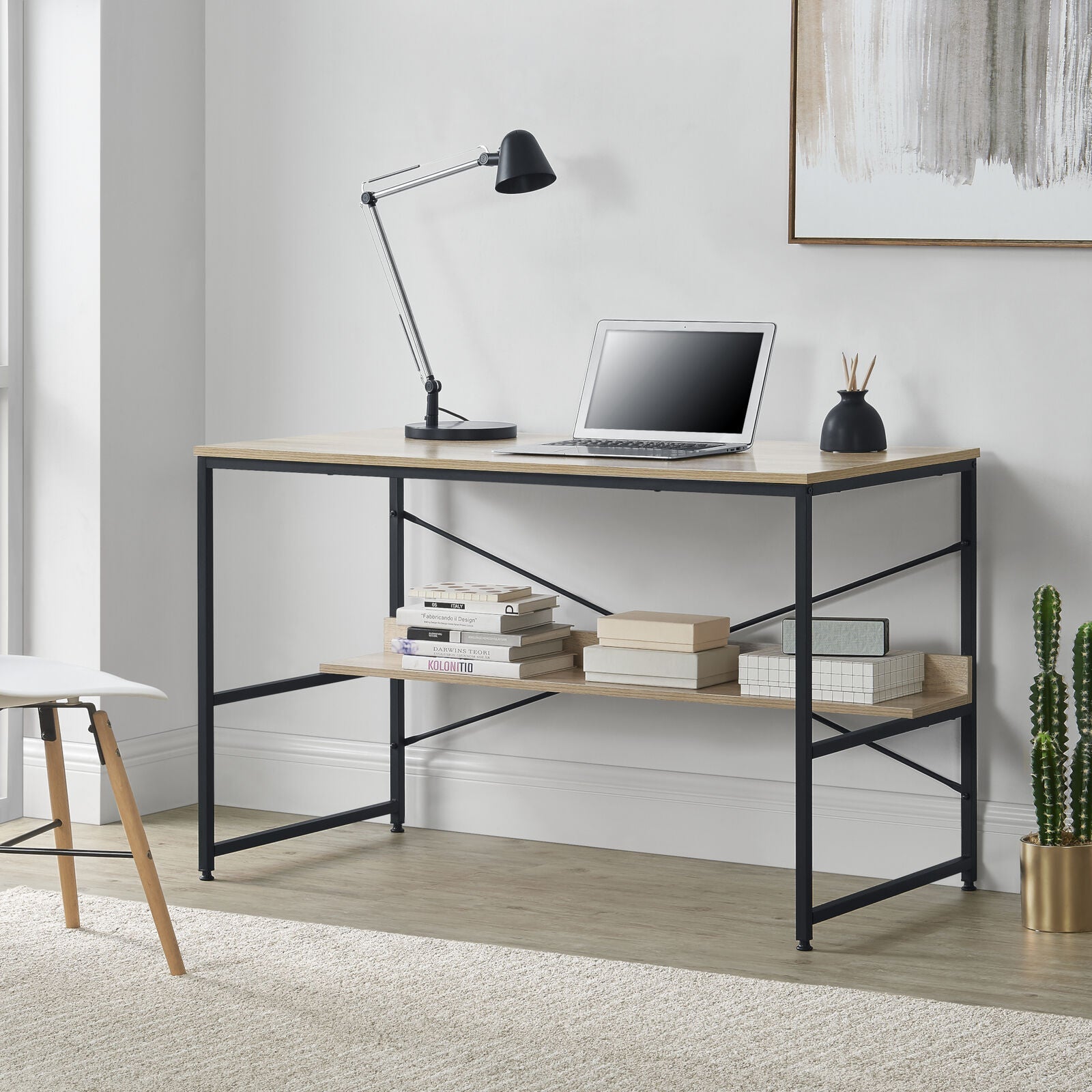 La scrivania con mensola é adatta per tenere libri, documenti o vari oggetti a portata di mano. Grazie alla struttura in acciaio, la scrivania é solida e stabile. É un'ottima scelta per arredare l'ufficio o lo studio, ma anche la cameretta dei ragazzi.