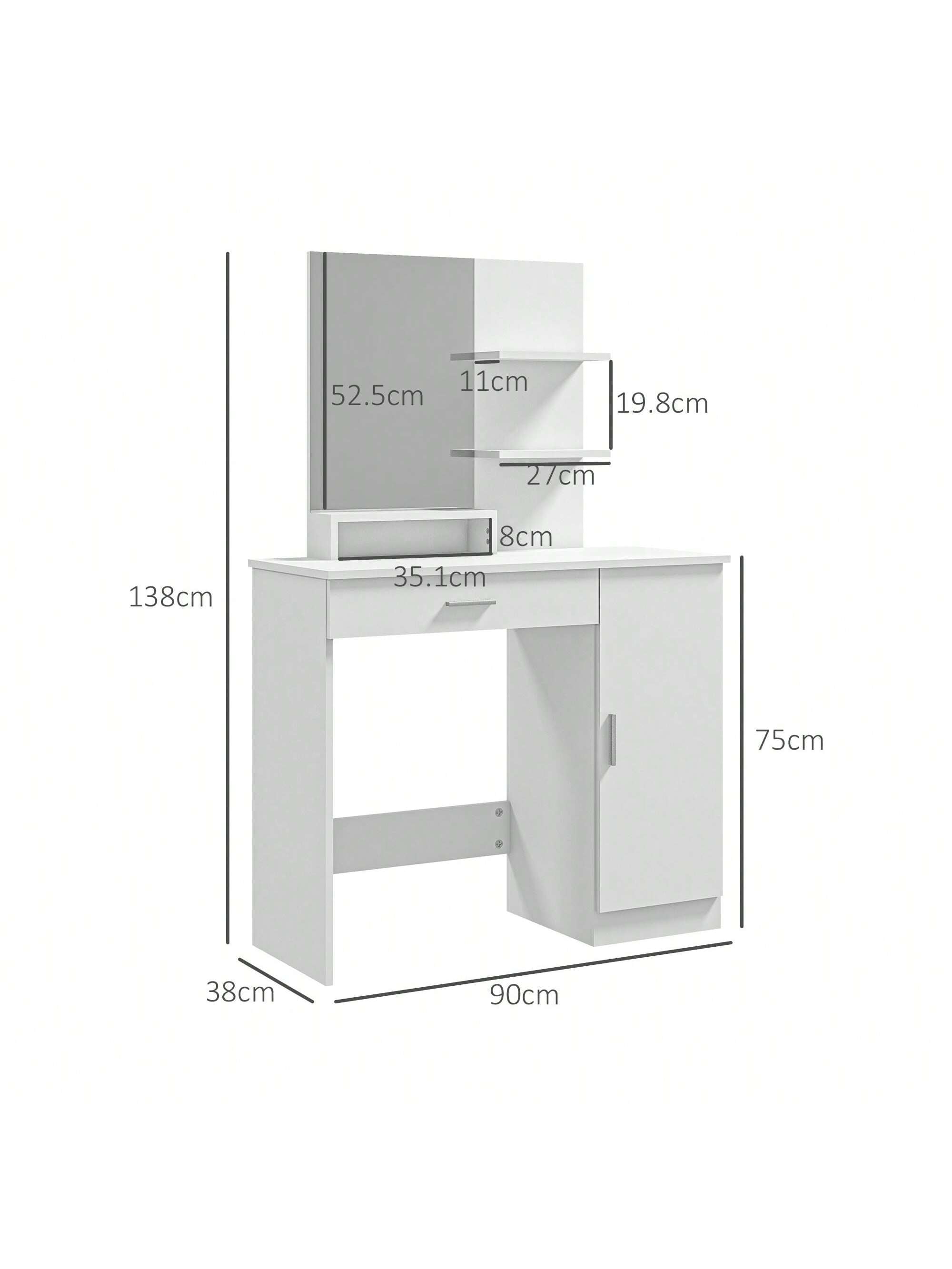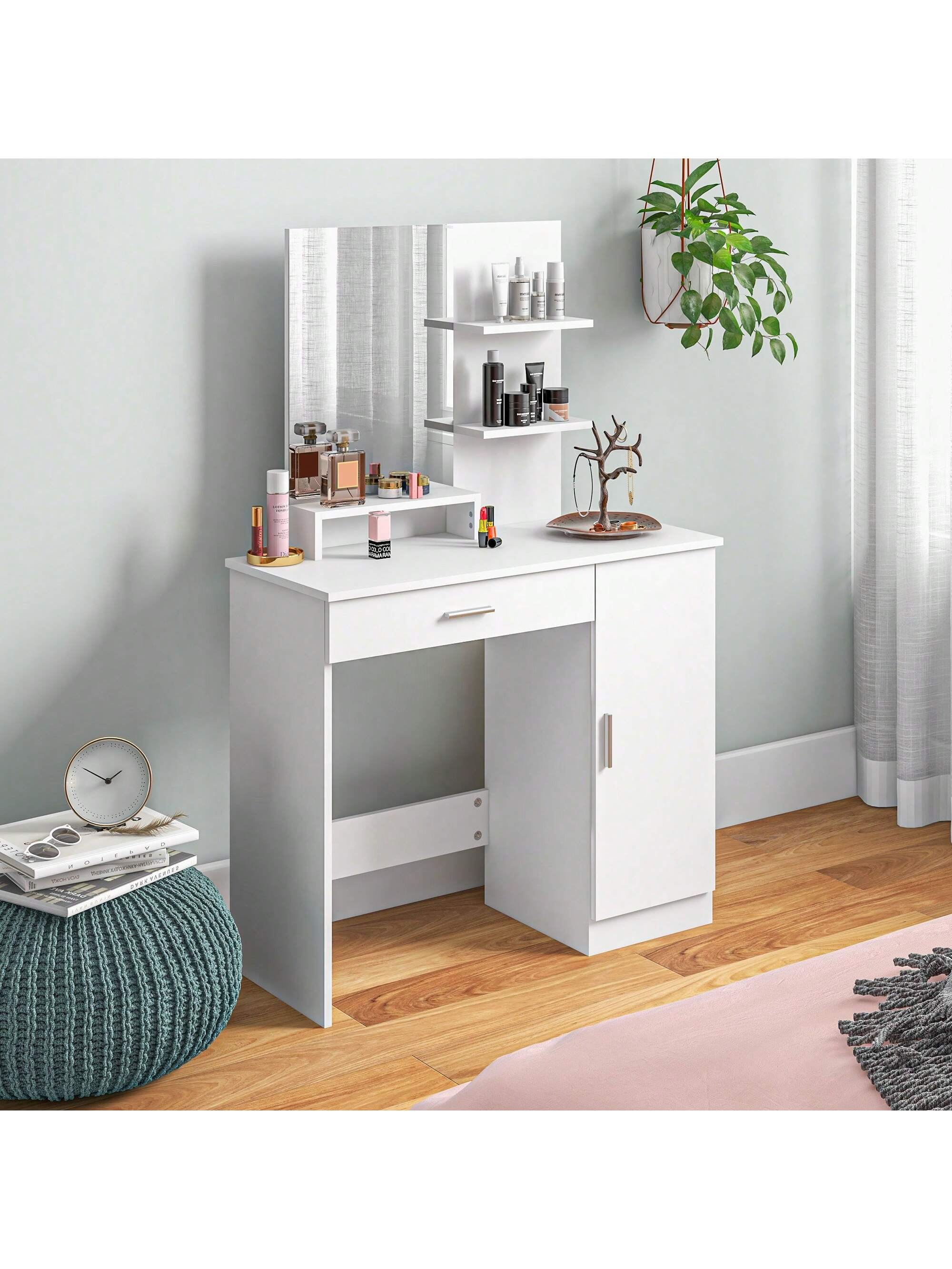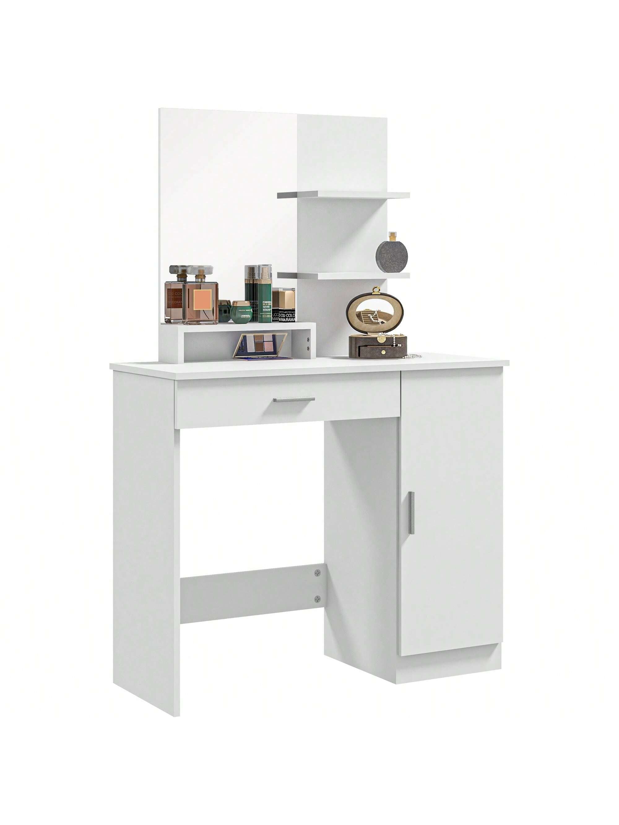 Tavolino da Trucco con Mobile con Anta, Cassetto, Specchio per Trucco e Ripiani Aperti
