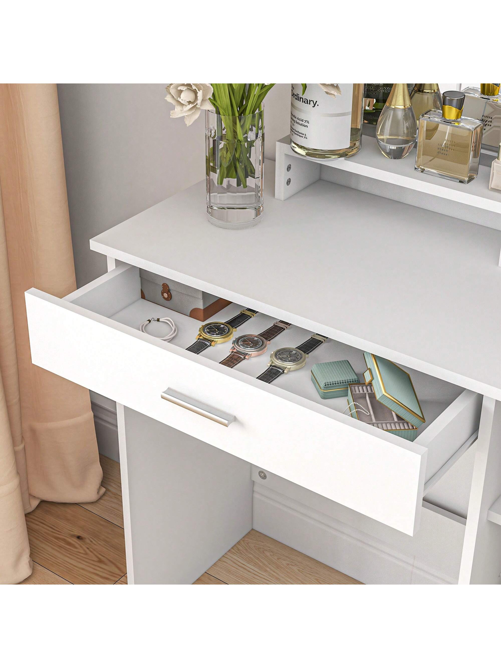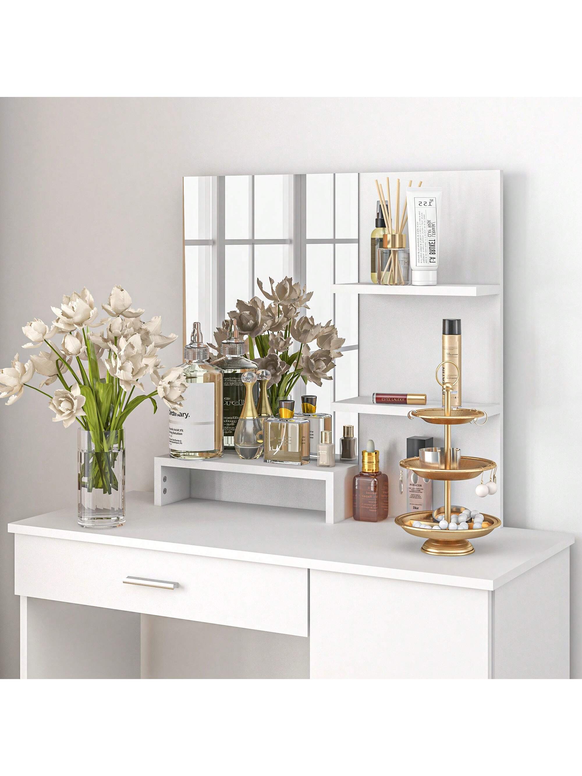 i suoi ripiani e il suo cassetto incluso consentono di organizzare e tenere a portata di mano tutti gli accessori di bellezza per facilitare la routine.