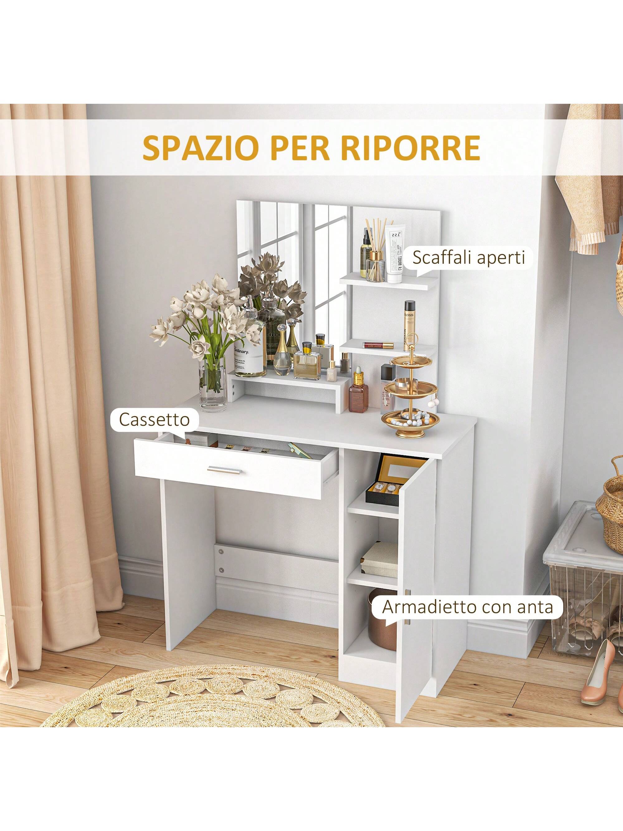 ● Tavolo per trucco dotato di un mobile con anta, un pratico cassetto e ripiani aperti