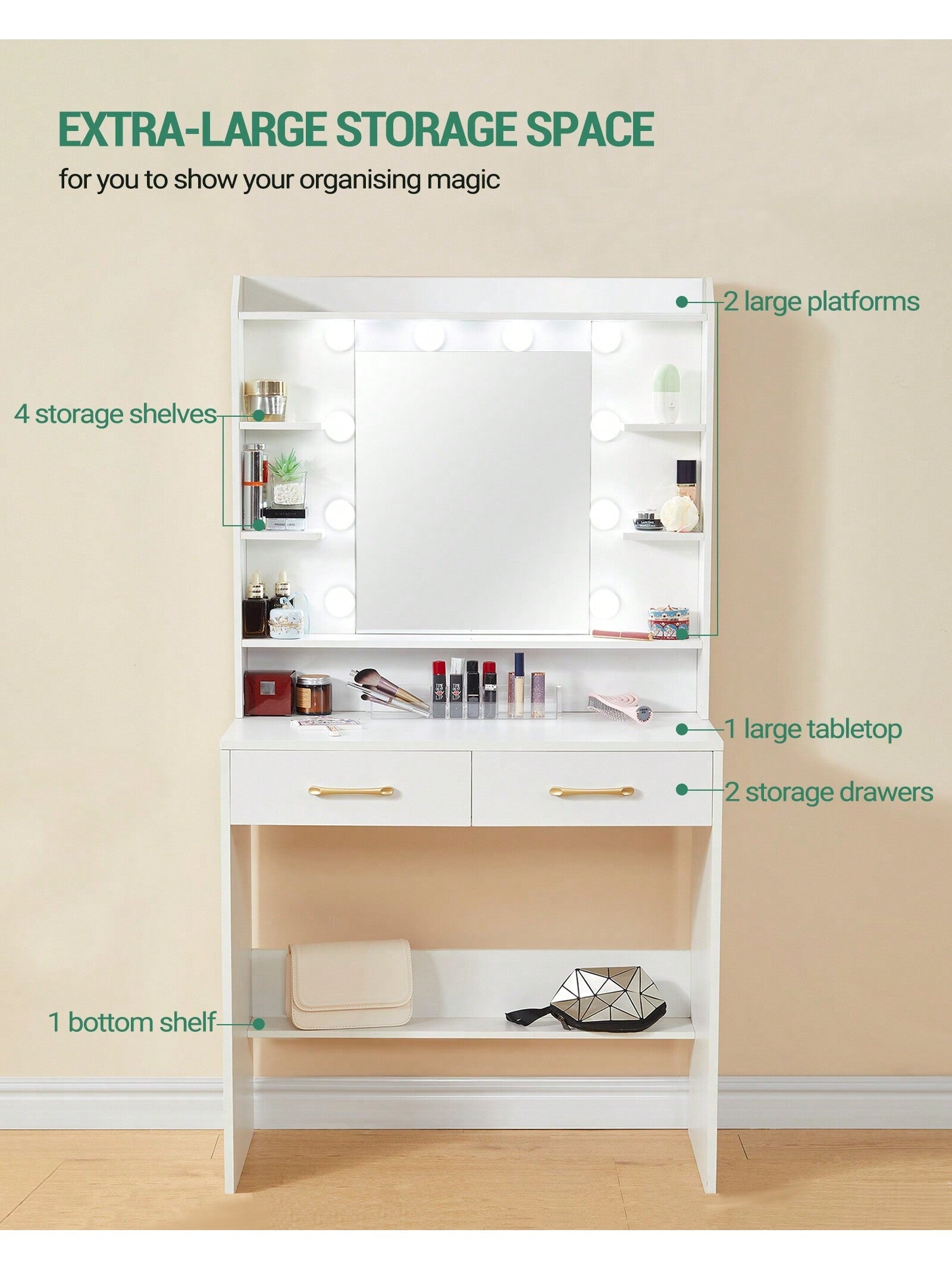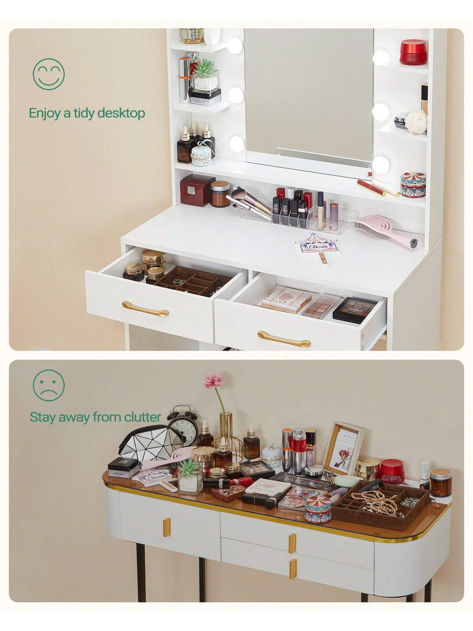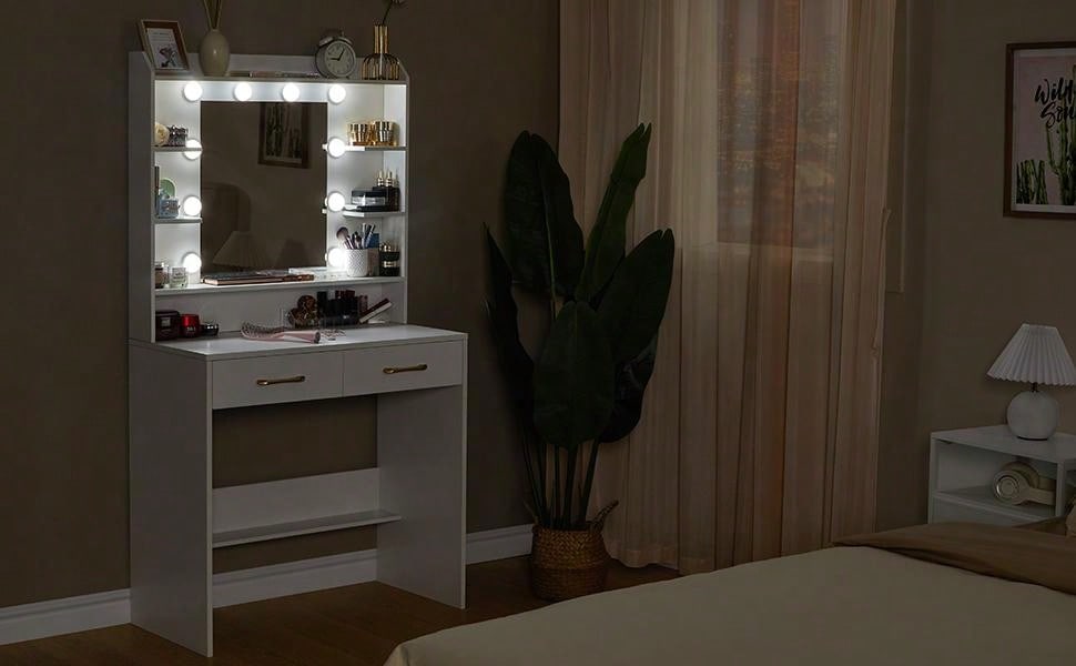 Con 6 scomparti aperti per i prodotti di bellezza, 2 cassetti e 1 ripiano inferiore, è possibile organizzare e accedere facilmente ai propri oggetti con comodità.