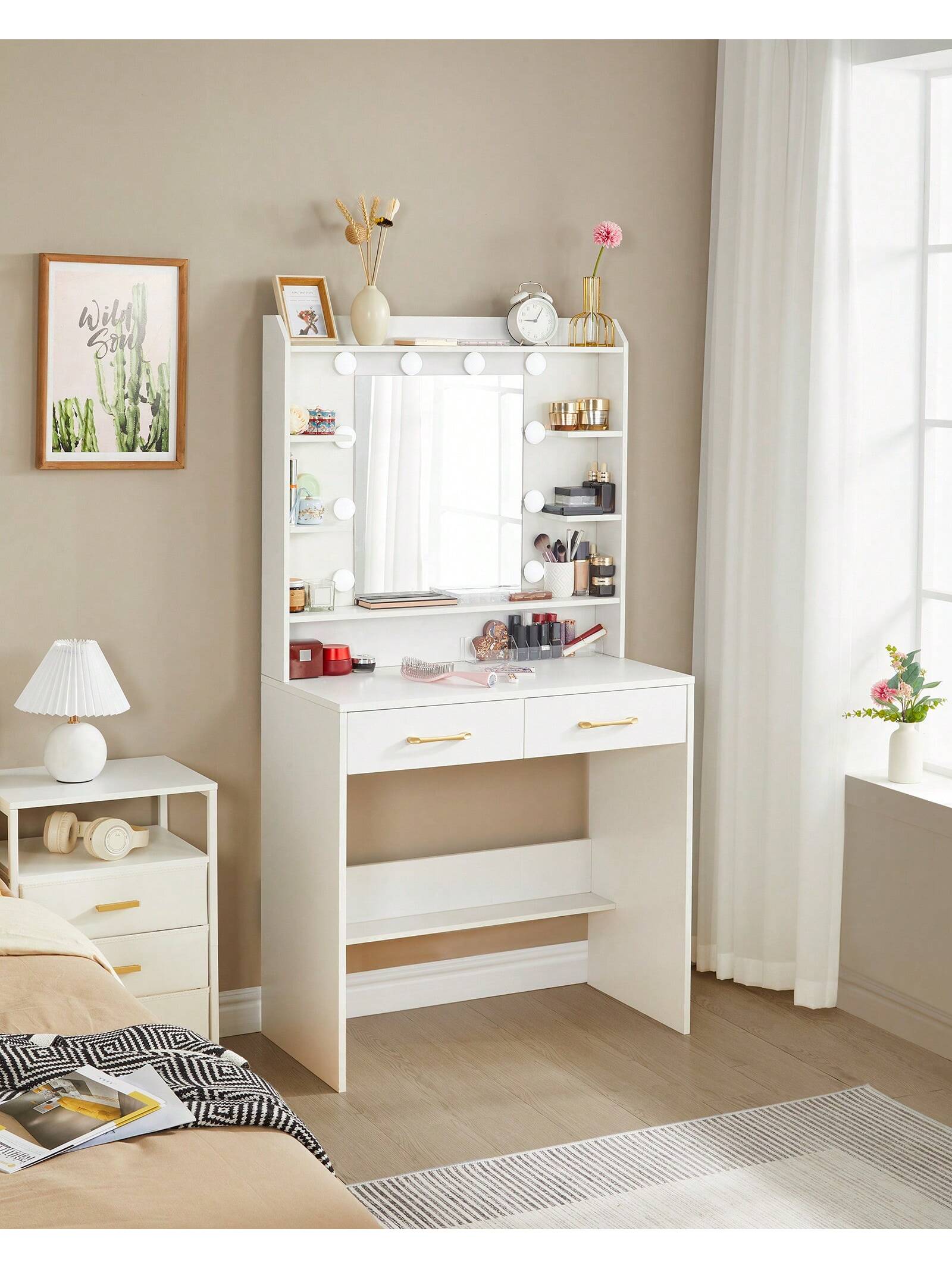 La cassettiera bianca trasparente non solo aggiunge un tocco estetico alla vostra stanza, ma fornisce anche una luce morbida e non abbagliante per una perfetta applicazione del trucco.